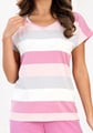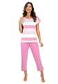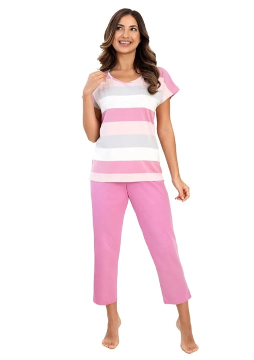 Dámské pyžamo 741/62 značky REGINA přináší do Vašeho večerního rituálu dokonalou kombinaci elegance a pohodlí. Horní díl s krátkým rukávem zdobí jemné pruhy v odstínech růžové a šedé na bílém podkladu, což vytváří svěží, ženský vzhled. Kulatý výstřih působí nenuceně a příjemně doplňuje celkový design. Spodní díl tvoří jednobarevné růžové kalhoty, které díky volnému střihu umožňují maximální komfort při nošení i domácím odpočinku.