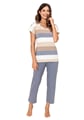 Dámské pyžamo 741/63 značky REGINA přináší spojení elegance a pohodlí, které oceníte při každém večeru i poklidném ránu. Horní díl s kulatým výstřihem a krátkými rukávy nabízí vzdušný střih, jenž zajišťuje volnost pohybu i příjemné nošení po celý rok. Jemné vodorovné proužky v odstínech krémové, světle hnědé, taupe a šedé vytvářejí decentní vzhled vhodný pro každou ženu hledající stylovou domácí pohodu. Dlouhé kalhoty v jednobarevné šedé ladí s horním dílem a díky elastickému pasu perfektně sednou bez pocitu stažení.