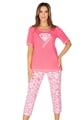 Dámské pyžamo 980 REGINA je dámské pyžamo s obrázkem, krátkým rukávem a vzorovanými capri kalhotami. Tričko je s obrázkem diamantu a nápisem ´glam´. Vzorované capri kalhoty jsou šité bez kapes a mají volnou gumu v pase. Pyžamo je možné používat i jako běžné oblečení na doma.