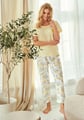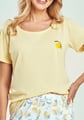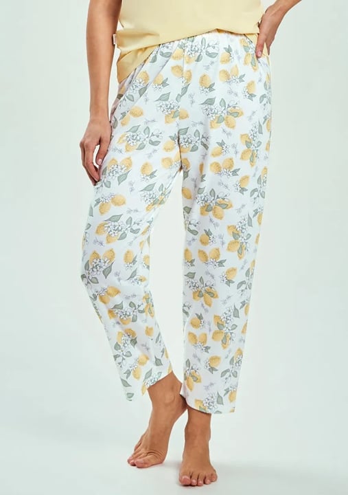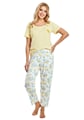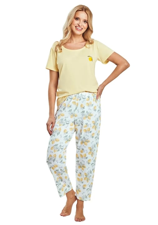 Dámské pyžamo Frida 3532 značky TARO přináší do Vašeho večerního rituálu svěžest a pohodlí. Horní díl v jemné pastelově žluté barvě je ušitý z lehkého, prodyšného materiálu, který je velmi příjemný k pokožce. Kulatý výstřih a decentní motiv citrónu na hrudi dodávají celku elegantní nádech s hravým detailem. Spodní díl tvoří dlouhé kalhoty s elastickým pasem pro maximální komfort během spánku i domácího odpočinku. Kalhoty s jemným vzorem citronů a lístků v pastelových tónech podtrhují mladistvý vzhled tohoto setu, zatímco volnější střih zajišťuje volnost pohybu po celý rok.