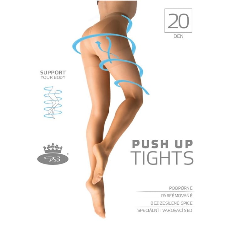 Dámské stahovací punčocháče PUSH UP tights 20 DEN beige jsou dámské tvarující punčochové kalhoty, které formují, zeštíhlují postavu a tvarují problémové partie ženského těla. Punčochové kalhoty PUSH UP 20 DEN díky extra zesílenému, speciálně formovanému pletenému sedu s vysokým podílem elastanu (100 DEN) efektivně působí hned ve 3 oblastech. Formují postavu zeštíhlením pasu a boků, zvednutím zadečku a zpevněním horní části stehen. Výsledek je okamžitý a opravdu viditelný. Speciální stahující punčochové kalhoty jsou mají neviditelnou špici a pro maximální komfort decentní malý bavlněný klín (ve velikosti XXL je klín velký). Tvarují punčochové kalhoty jsou jemně parfémované, dodáváme je pečlivě balené v extra sáčku v obálce. Elegantní jemné punčocháče pro každou ženu a příležitost.