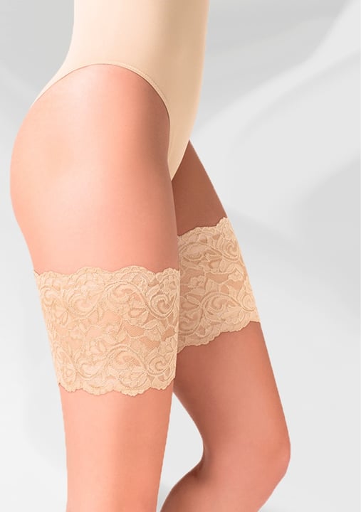 Dámské samodržící stehenní pásy s ochanou proti oděru ozdobené jemnou krajkou. Opatřené dvěma silikovými pásky na vnitřní straně, zaručují tak správné držení na noze.