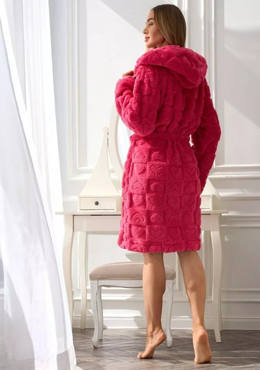 Dámský župan Valentine raspberry značky L&L je ztělesněním pohodlí a elegance, které si můžete dopřát každý den. Jeho výrazná malinová barva rozjasní Váš domov a přinese pocit radosti i v chladných ránech. Měkký materiál Wellsoft Vás zahalí do hebkosti, zatímco kapuce poskytuje příjemné teplo pro hlavu i krk. Díky zavazování v pase si snadno upravíte střih podle svých představ a užijete si volnost pohybu díky kratší délce po kolena.