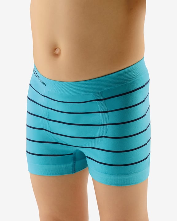 GINO 25997P jsou boxerky s kratší nohavičkou, chlapecké bezešvé prádlo. Pasový kraj je zesílený a zapravený bezešvým způsobem. Nohavičky jsou zapravené bezešvým způsobem. V rozkroku je všitý klínek. Na předním díle jsou boxerky tvarovány vypletenými zónami. Boxerky mají úzké kontrastní proužky. V záložce je vypletené barevné logo.
