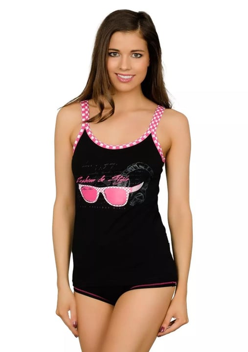 Dívčí bavlněná košilka s úzkými kostkovanými ramínky. Košilka je s obrázkem slunečních brýlí a nápisem ´Fashion & Style´. Košilku je možné používat i jako běžné letní tílko.