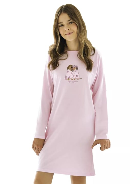Dívčí noční košile Jasmine značky 3505 TARO přináší do večerního rituálu pocit lehkosti a pohodlí, který si každá dívka zamiluje. Jemný pastelově růžový odstín působí uklidňujícím dojmem a spolu s hravým potiskem dvou pejsků vytváří radostnou atmosféru pro klidné usínání i odpočinek během dne. Díky volnému střihu a dlouhým rukávům poskytuje dívčí noční košile dostatek prostoru pro volný pohyb, zatímco měkký materiál příjemně hladí pokožku.