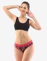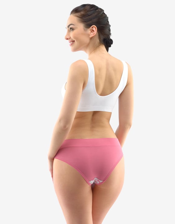 GINA 14148P jsou bokové kalhotky francouzského střihu se širokým bokem a širším pasovým lemem, dámské šité prádlo. Pasový kraj je začištěný širším lemem ze stejného materiálu. Nohavičky jsou začištěné úzkým lemem ze stejného materiálu. Přední díl je potištěný. Zadní díl a lemy jsou jednobarevné.