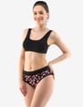 GINA 10267P jsou kalhotky klasického střihu se širším bokem, dámské šité prádlo. Pasový kraj je začištěný širším lemem ze stejného materiálu. Nohavičky jsou začištěné úzkým lemem ze stejného materiálu. Přední díl je potištěný. Zadní díl a lemy jsou jednobarevné.