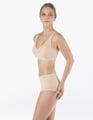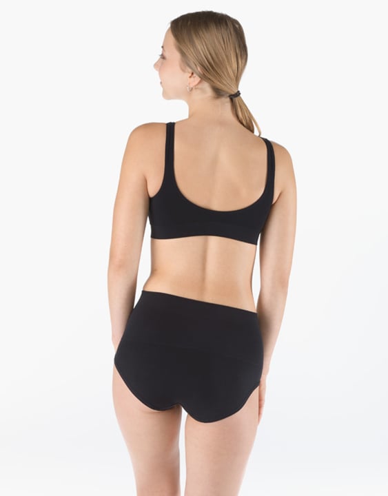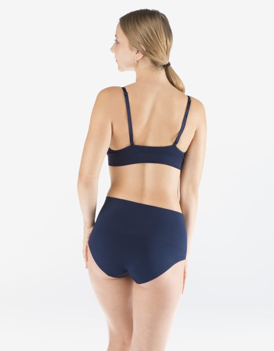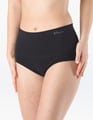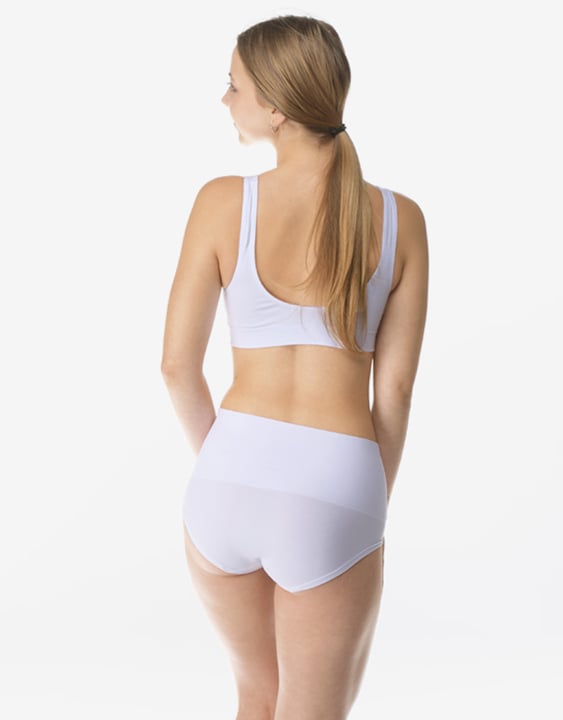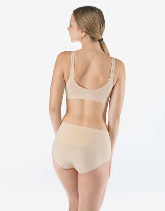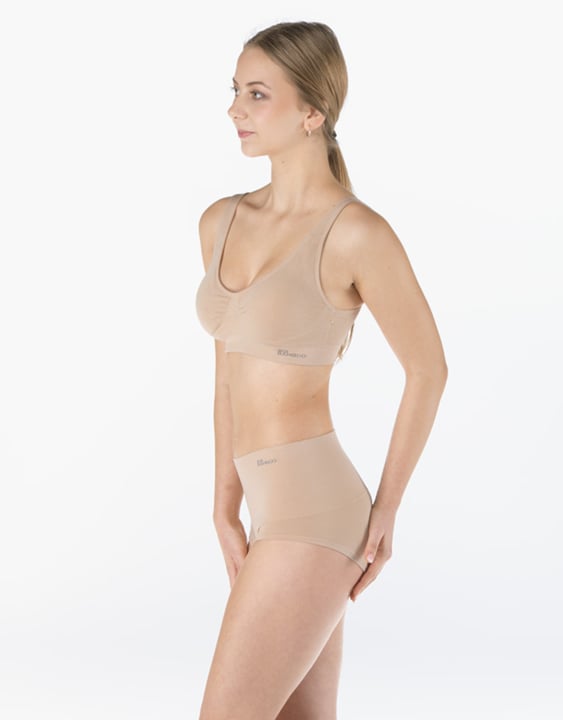 Kalhotky klasického střihu vyšší se širokým bokem a širkou pasovou záložkou, dámské bezešvé prádlo. Pasový kraj je zesílený a zapravený bezešvým způsobem. Nohavičky jsou začištěné podehnutím. Kalhotky jsou jednobarevné. V pasové záložce je vypletené logo.
