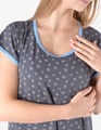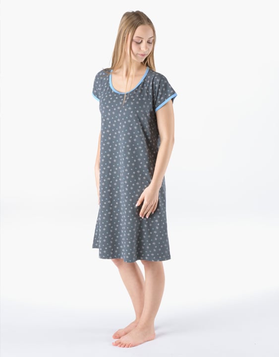 Dámská noční košilka s krátkým rukávem GINA 19176P je noční košilka s krátkým rukávem vyrobena z příjemného materiálu bambusové viskozy, která Vám poskytne jedinečné pohodlí během spánku. Kulatý výstřih a rukávy jsou olemovány světle modrým proužkem, košilka je potištěna jemným květinovým vzorem.