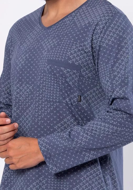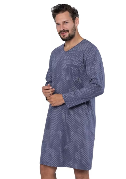 Pánská noční košile Antoni 1681 značky HOTBERG představuje ideální volbu pro muže, kteří si potrpí na pohodlí a vkusný vzhled i během odpočinku. Tento model zaujme klasickým střihem sahajícím ke kolenům, který poskytuje maximální volnost pohybu a pocit lehkosti po celý večer. Šedá barva s decentním vzorem dodává elegantní charakter bez zbytečné okázalosti. Véčkový výstřih usnadňuje oblékání a dlouhé rukávy zajistí příjemné teplo v chladnějších nocích. Praktická náprsní kapsa je nejen stylovým detailem, ale také užitečným prvkem pro drobnosti.