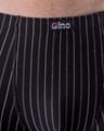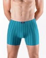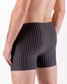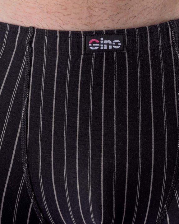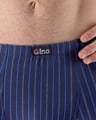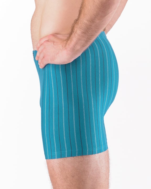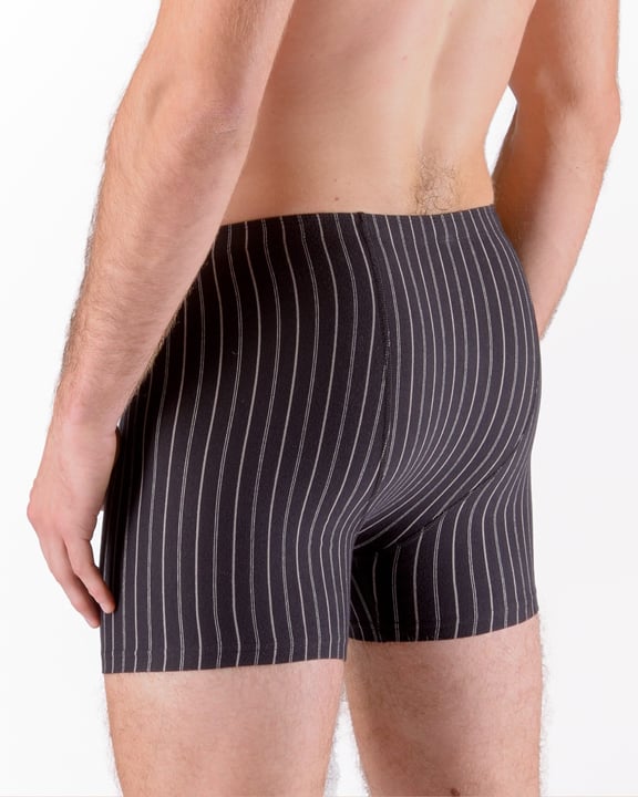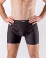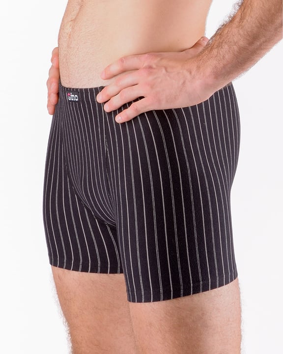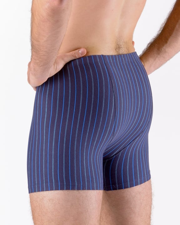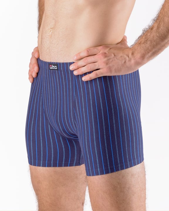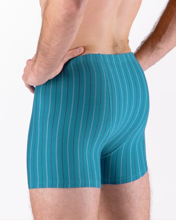 Pánské boxerky s delší nohavičkou mají zadní díl členěn dvěma švy, jsou z bavlněného úpletu doplněném o elastanová vlákna. Tento materiál má vypletený pruhovaný vzor, je pružný a pohodlný pro každodenní nošení.
