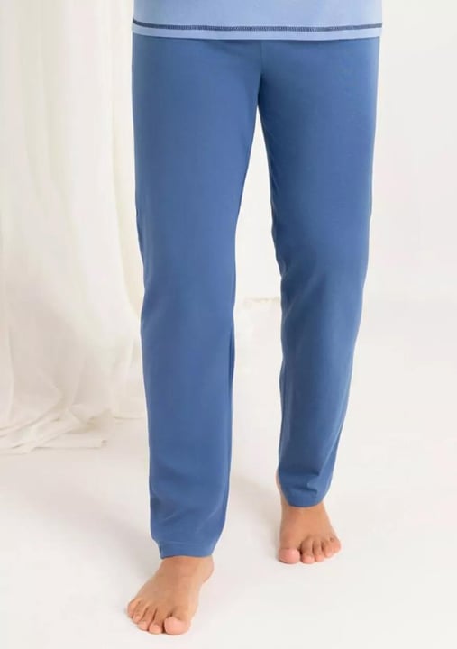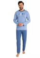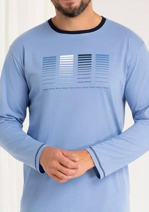 Pánské pyžamo 487/53 značky REGINA přináší do Vašeho večerního rituálu spojení elegance a pohodlí. Tento stylový komplet v jemném světle modrém odstínu s kontrastním tmavě modrým výstřihem a decentním grafickým motivem na hrudi působí moderně. Díky volnému střihu horní části si užijete maximální volnost pohybu, zatímco dlouhé kalhoty s elastickým pasem zaručí komfort po celou noc. Materiál ze 100% bavlny je měkký, prodyšný a šetrný k pokožce – ideální pro klidné spaní i domácí relaxaci.