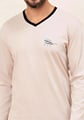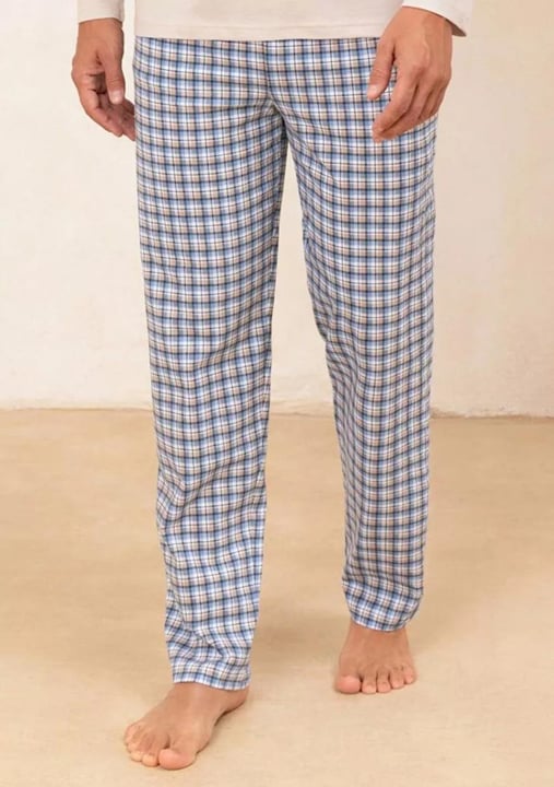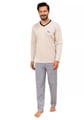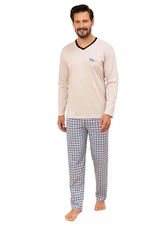 Pánské pyžamo 491/52 značky REGINA přináší do Vašeho večerního rituálu kombinaci nadčasové elegance a pohodlí. Vrchní díl v jemném béžovém odstínu s kontrastním černým lemem u výstřihu véčkového tvaru působí stylově, zatímco decentní obrázek na hrudi dodává osobitý detail. Dlouhé rukávy jsou ideální pro chladnější noci a poskytují příjemný pocit tepla. Spodní část tvoří volné kalhoty s moderním kostkovaným vzorem v modrých tónech, které zajišťují maximální komfort při každém pohybu. Celý komplet je vyroben ze 100% bavlny – materiálu známého svou měkkostí, prodyšností i šetrností k pokožce.