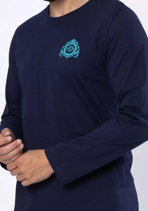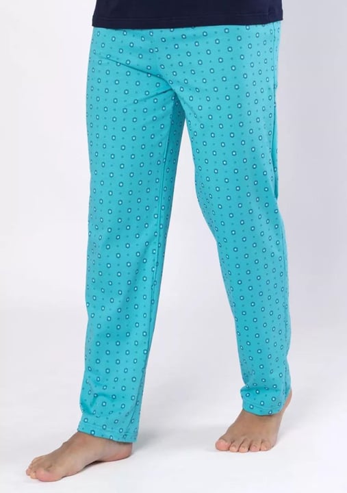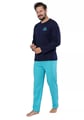 Pánské pyžamo Gawel 1689 značky HOTBERG přináší dokonalou kombinaci elegance a pohodlí pro Váš večerní odpočinek. Horní díl v tmavě modré barvě s kulatým výstřihem působí decentně, zatímco jemná výšivka na hrudi dodává osobitý detail. Kalhoty v tyrkysovém odstínu s geometrickým vzorem vytvářejí svěží kontrast a zároveň zůstávají nenápadné i stylové. Volný střih kalhot poskytuje maximální komfort při spánku i domácím lenošení.