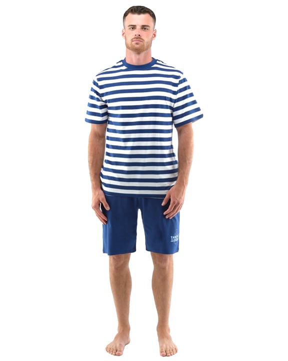 Základem kvalitního spánku je vaše pohodlí, ke kterému vám pomůže i pohodlné noční prádlo. Triko s kruhovým výstřihem má vyplétaný pruhovaný vzor a krátké jednobarevné šortky jsou doplněny o solitérní potisk na levé nohavici. Bavlněný úplet je ideální volbou materiálu pro noční prádlo a potěší příznivce přírodních materiálů. Budete se v něm cítit doslova jako v bavlnce.