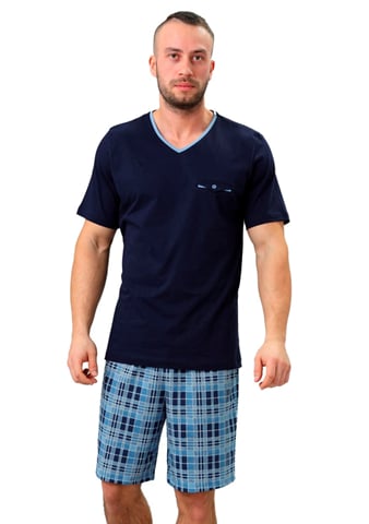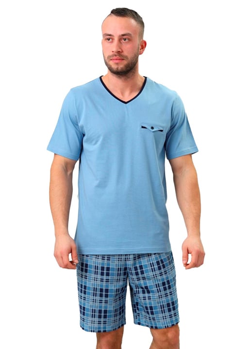 Pánské bavlněné pyžamo s krátkým rukávem a kraťasy. Jednobarevné tričko je ozdobené kapsou a barevným lemem okolo výstřihu. Kostkované kraťasy jsou šity bez kapes a mají všitou gumu.