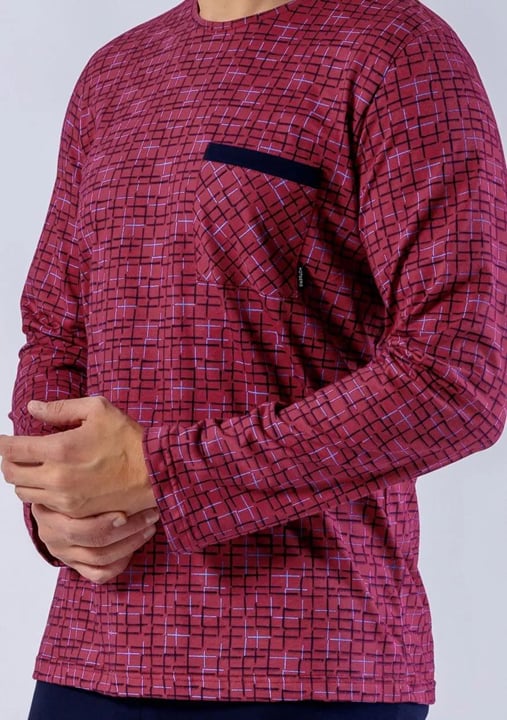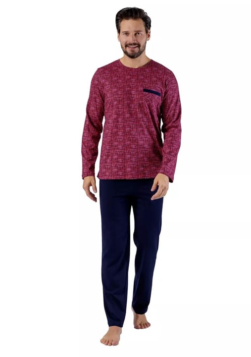 Pánské pyžamo Roman 1600 značky HOTBERG představuje spojení elegantního vzhledu a pohodlí, které ocení každý muž hledající kvalitní domácí oblečení. Vrchní díl ve vínové barvě se vzorovanou strukturou působí svěže a moderně, zatímco kontrastní náprsní kapsa v tmavě modré barvě dodává celku stylový akcent. Dlouhé rukávy spolu s kulatým výstřihem zajišťují příjemné teplo i během chladnějších nocí.