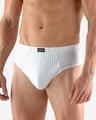 Pánské slipy se širším bokem GINO 71093P jsou pánské, šité slipy se širším bokem. V pasovém kraji je zašitá širší pruženka. V nohavičkách je zašitá úzká pruženka. Slipy jsou vyrobené z materiálu s vypletenými proužky.