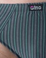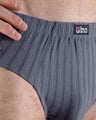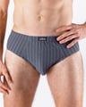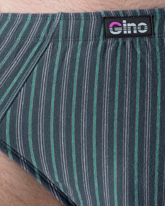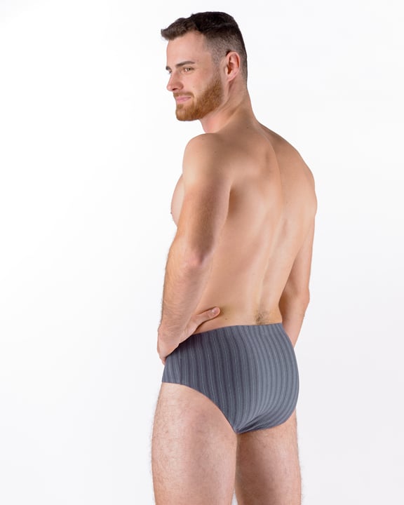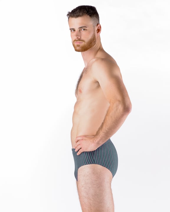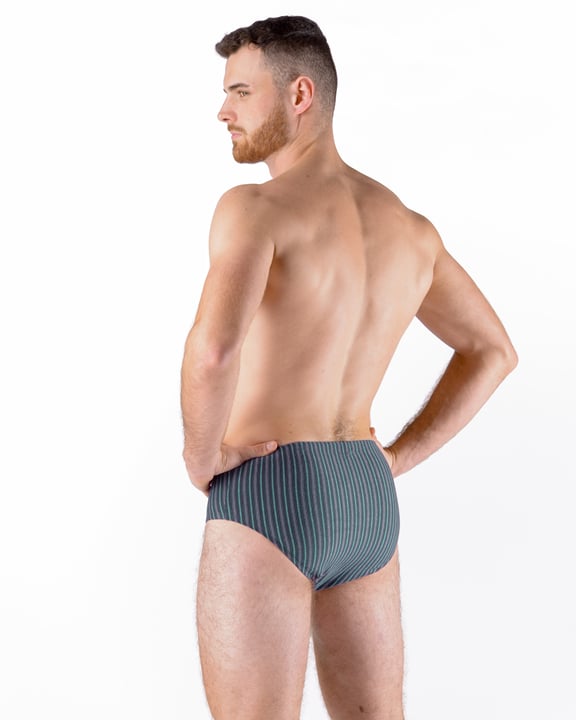 Slipy se širším bokem, pánské šité prádlo. V pasovém kraji je zašitá širší pruženka. V nohavičkách je zašitá úzká pruženka. Slipy jsou vyrobené z materiálu s vypletenými proužky.