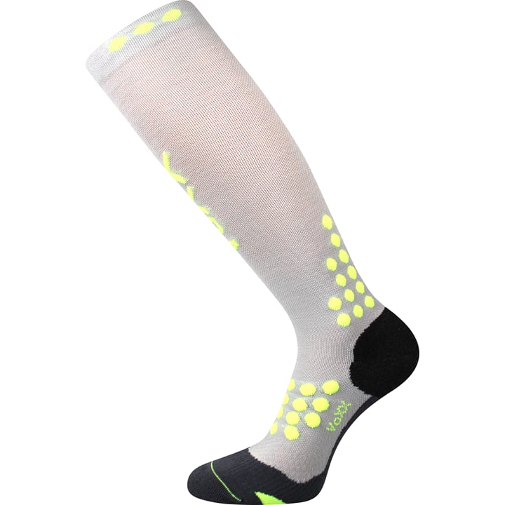 Kompresní podkolenky VoXX MARATHON jsou dámské a pánské sportovní podkolenky s vyvzorovanou patou a řetízkovanou špicí, speciální konstrukce zamezuje přetáčení v botě, anatomicky tvarované polstrované zóny brání vzniku otlaků a puchýřů. Kompresní podkolenky napomáhají pevnějšímu držení a vyšší stabilitě kotníku, zapletením materiálu silproX s ionty stříbra zajišťuje antibakteriální ochrana a jemné polstrování materiálem DRYTEX zajistí maximální komfort a odvod potu při vysoké sportovní zátěži.