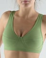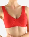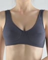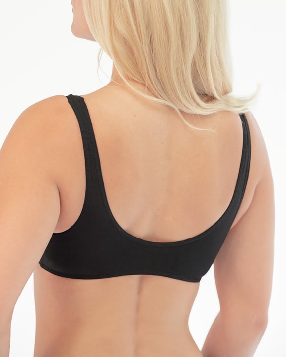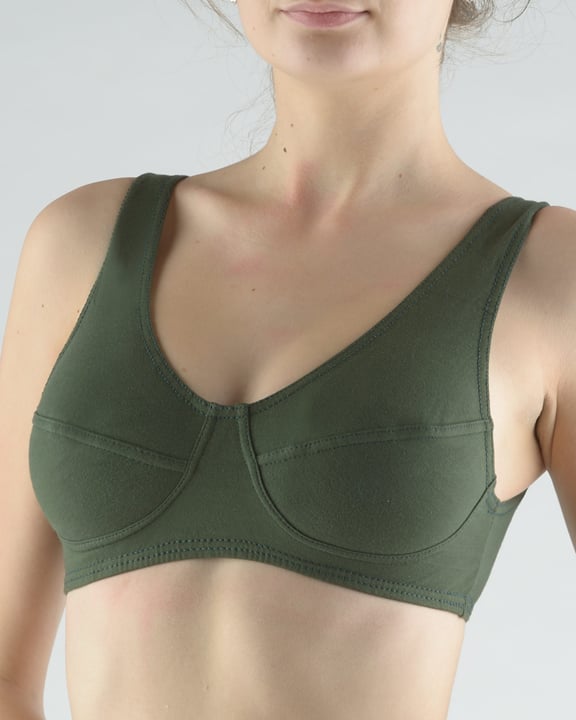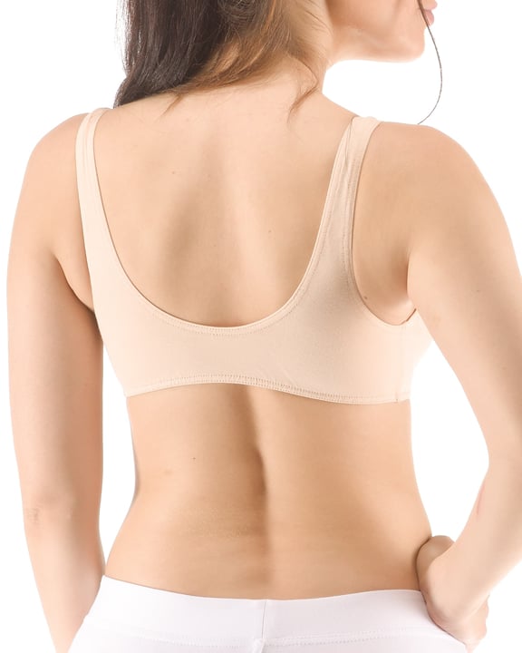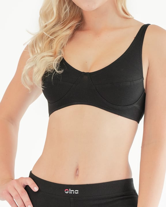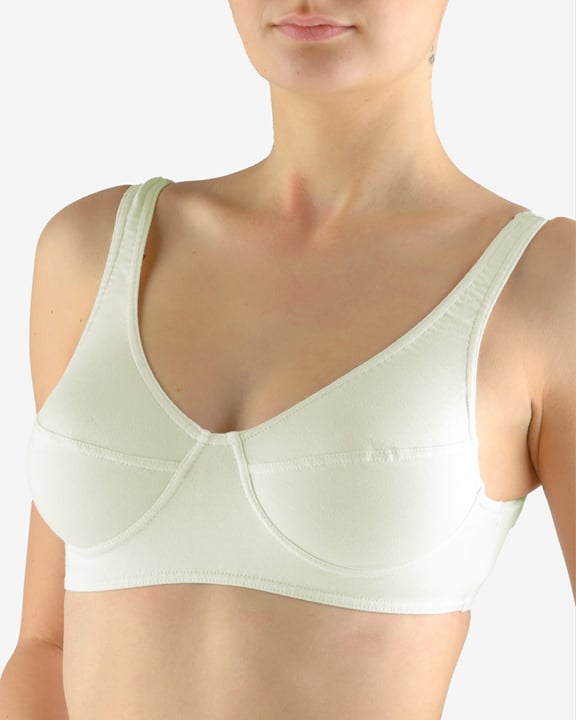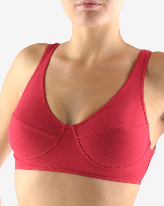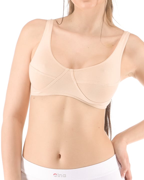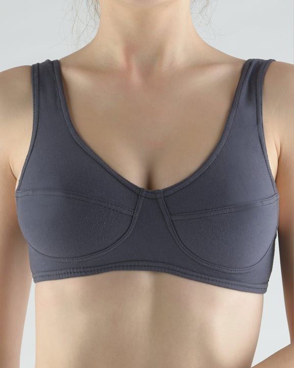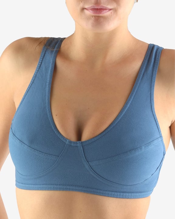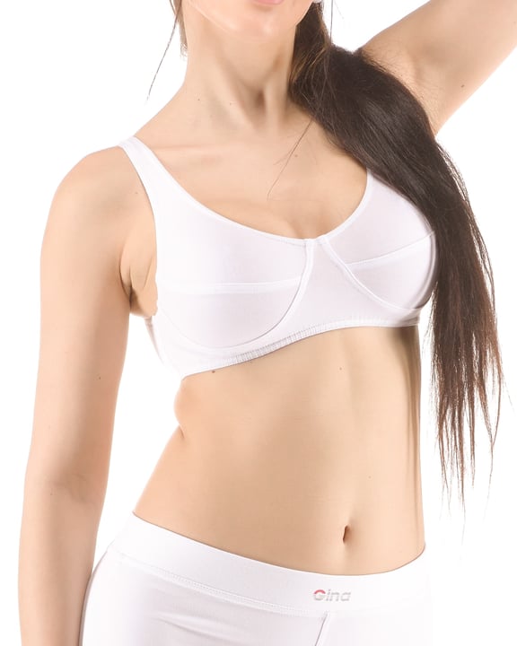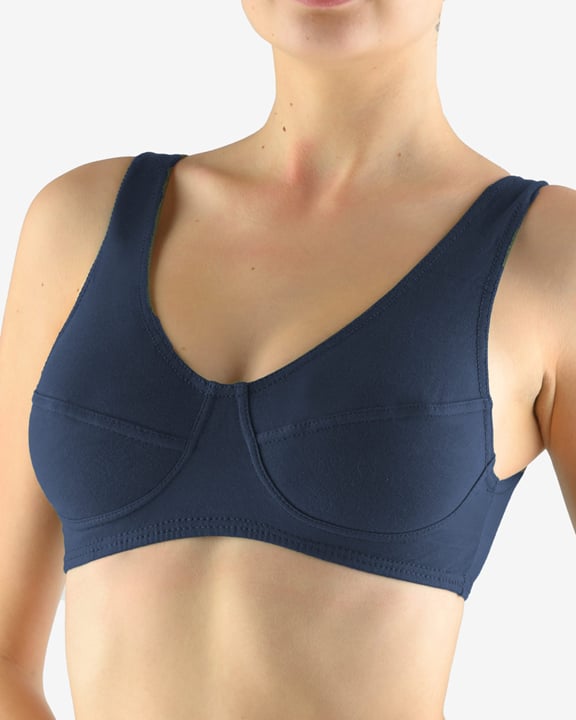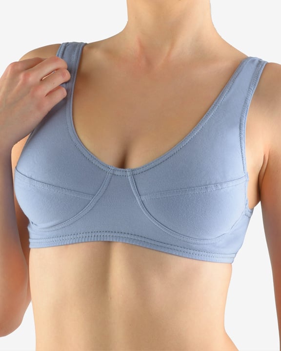 Podprsenka se širšími ramínky přes hlavu, dámské šité sportovní prádlo. V dolním kraji je zašitá úzká pruženka. V průramcích a průkrčníku je zašitá úzká pruženka. Podprsenka je jednobarevná.