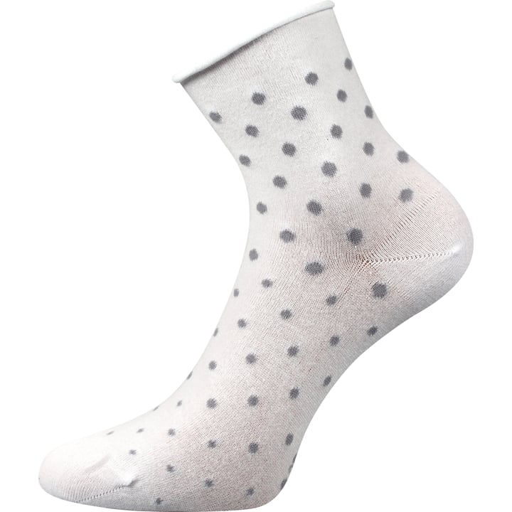 Dámské ponožky Lonka FLAGRAN jsou dámské letní ponožky, které vás okouzlí veselými barevnými puntíky, které se od prstů postupně zvětšují. Elegantní a jednoduché ponožky v mixu černé nebo bílé barvy doplňuje rolovací lem. Tento lem je nestahující a nohy neškrtí. Kvalitní slabé ponožky mají pro maximální pohodlí při nošení špičku spojenou plochým řetízkováním, které netlačí a nezpůsobuje puchýře ani otlaky. Upletené jsou na 200 jehlových strojích, proto jsou velmi jemné. Bavlněné ponožky jsou vhodné pro běžné nošení na doma i v práci. Střední výška ponožky je ke kotníku, ideální na nošení v létě.