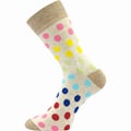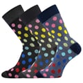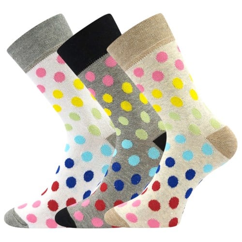 Ponožky IVANA 60 jsou dámské tenké klasické ponožky ideální na léto. Přírodní materiál bavlna vyniká vysokou savostí vlhkosti a je velmi příjemná na omak. Vyšší podíl bavlny je doplněný o elastan, takže ponožka je příjemná na pokožce, ale zároveň je pružná a dobře si drží tvar. Lem ponožek je jemný, nohy nestahuje a neškrtí. Výhodné balení slabých ponožek s veselými barevnými puntíky obsahuje 3 páry, ve světlém a tmavém mixu.