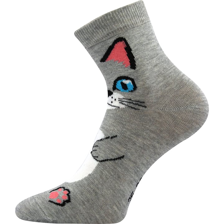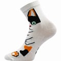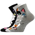 Ponožky MICKA jsou dámské slabé vtipné ponožky s motivem koček. Středně vysoké ponožky nad kotník jsou z přírodního materiálu bavlna, který vyniká vysokou schopností pohltit vlhkost a je velmi příjemná k pokožce. Podíl elastanu zaručí pružnost a ponožky dobře drží svůj tvar. Lem ponožek je jemný, nestahující. S veselými ponožkami se budete cítit fajn jak doma, tak i v práci.