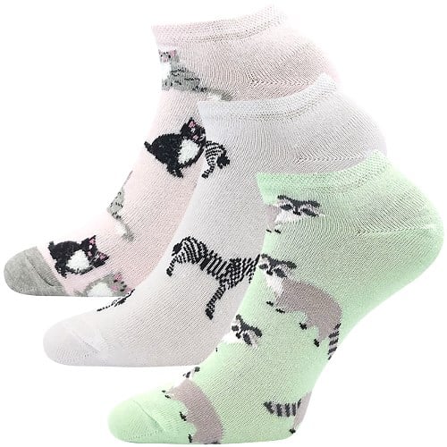 Ponožky PIKI 71 jsou dámské krátké letní ponožky z přírodní bavlny doplněné o pružný elastan. Jsou příjemné na nošení a výborně sedí na noze. Výhodné balení slabých barevných ponožek s obrázky koček, zeber a mývalů obsahuje 3 páry.