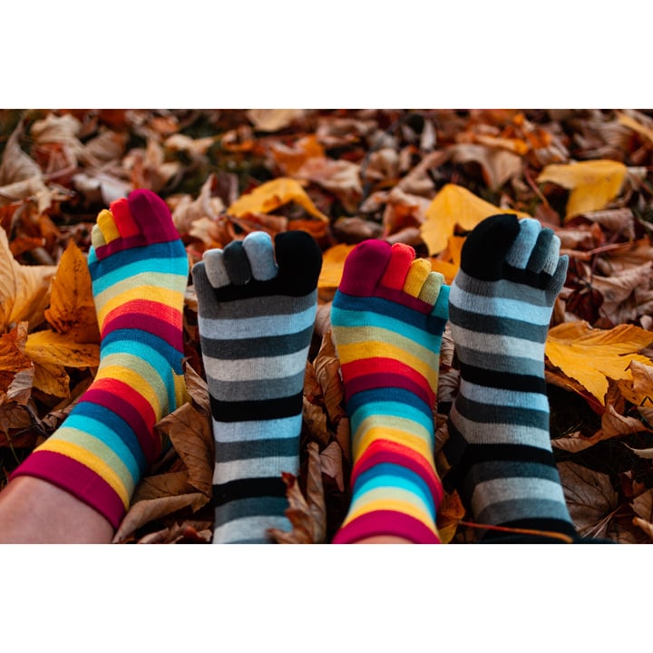 Prstové ponožky PRSTAN-A 10 jsou dámské i pánské vyšší pruhované ponožky, které oblékají a chrání i prsty na noze. Veselé ponožky mají vysoký podíl přírodní bavlny, díky které jsou jemné na omak a dobře pohlcují vlhkost. Prstové ponožky jsou vyšší a hodí se nejen do barefootové ale i fivefingers obuvi.
