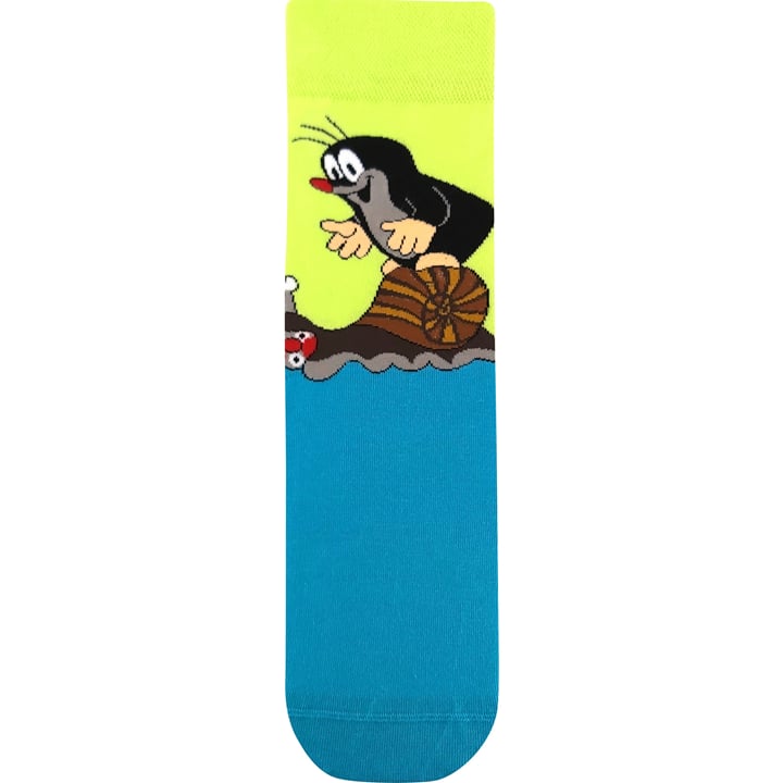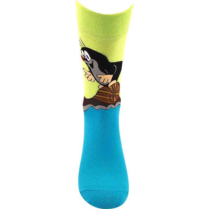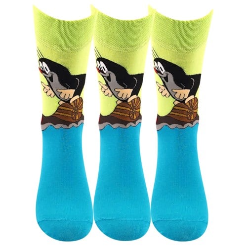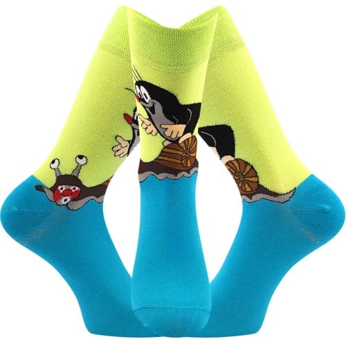 Ponožky s krtkem BOMA KR 211 jsou dámské a pánské vtipné slabé ponožky s roztomilým obrázkem Krtka od malíře Zdeňka Milera. Vraťte se do říše pohádek a pořiďte si Krtečka do svého šatníku. Klasické ponožky s vysokým podílem bavlny oživí váš outfit, ať už nosíte oblek nebo džíny. 200 jehlový úplet je velmi jemný, vypletený obrázek má díky tomu detaily velmi ostré.