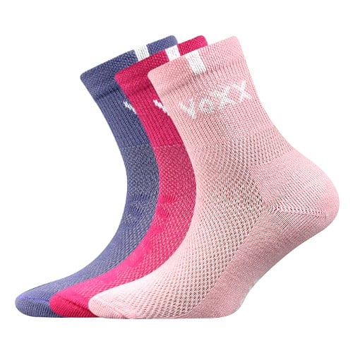 Ponožky VoXX FREDÍK jsou dětské ponožky v teplotní třídě A - jsou tou správnou volbou pro letní období od +10°C do +35°C. Sportovní ponožky využijete pro fitness a další sportovní aktivity po celý den. Vlhkost pohlcující bavlna je doplněná o elastan, který ponožkám dodává pružnost a dobře sedí na noze. Slabé ponožky ve střední výšce nad kotník mají prodyšnou zónu na nártu, které nohy odvětrává a udržuje ten správný komfort. Ponožky můžete mít v mixu 3 párů, rozlišené na chlapecké a dívčí ponožky.