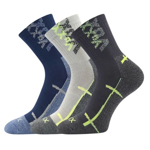 Ponožky VoXX WALLÍK jsou dětské sportovní na omak velmi jemné ponožky se zesíleným froté chodidlem, tlumícím nárazy. Volný lem nohu nestahuje a nezařezává se do pokožky. Vysoký podíl bavlny je příjemný na pokožce a ionty stříbra v materiálu silproX®, který zabraňuje zápachu, ochrání vaše nohy při každodenním nošení. Antibakteriální barevné ponožky v teplotní třídě B jsou pro každodenní použití v rozmezí teplot od -5°C do +20°C. a dostupné ve výhodném balení 3 párů v mixu barev.