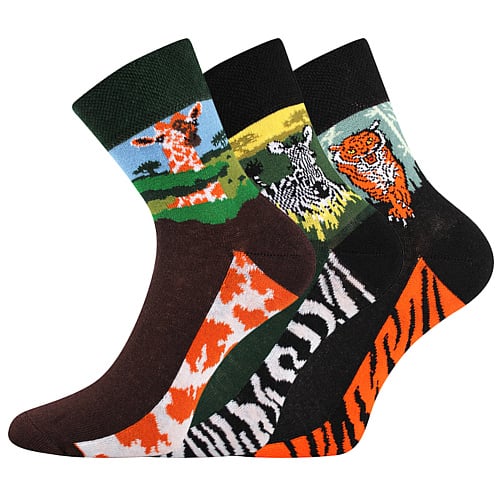 Ponožky XANTIPA 58 jsou dámské letní ponožky s prázdninovým safari designem. Ponožky mají vysoký podíl bavlny a pružného elastanu. Díky tomu jsou ponožky jemné na omak, příjemné na nošení a dobře pohlcují vlhkost a zároveň dobře drží na noze. Dostupné ve výhodném balení 3 párů s obrázky žirafy, zebry a tygra.