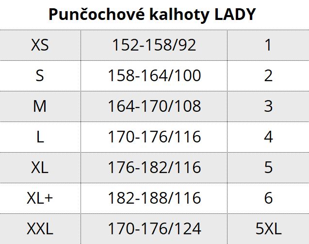 Punčochové kalhoty LADY TIGHTS 15 DEN jsou společenské, jemné punčochové kalhoty se zesílenou špicí a sedem. Jsou vyrobené z kvalitního úpletu a jsou parfémované. Velikost 170-176/124 má zesílený klín.