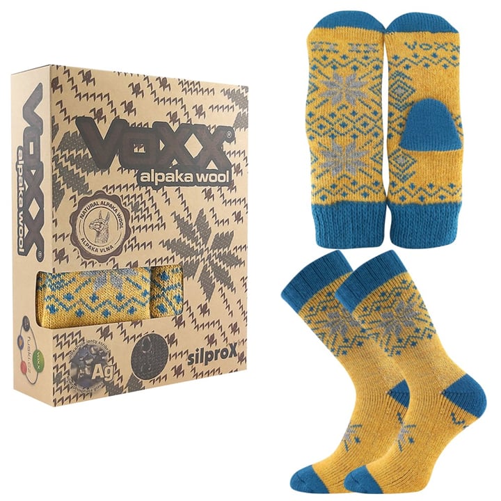 Dárková krabička ponožek a palčáků VoXX ALTA SET je sada dámských silných vlněných ponožek ponožek a pletených palčáků ve stejném designu. Vaše nohy i ruce budou jako v bavlnce díky jejich silnému froté doplněného navíc o polstrované zóny proti otlakům a puchýřům. Jemný svěr lemu nikde nohu nestahuje, vysoká prodyšnost materiálu zajišťuje komfort při nošení. Díky antibakteriální ochraně ionty stříbra nebude vznikat žádný zápach a se samotnými přírodní materiály merino vlna a vlna alpaka zažijete maximální tepelný comfort. Jsou řazené do teplotní třídy D v rozmezí -35°C až -10°C.
