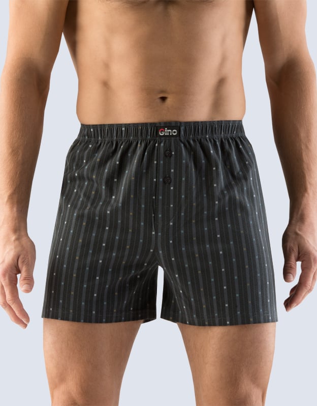 Volné trenky, pánské šité prádlo. V pasovém kraji je zašitá širší pruženka. Nohavičky jsou začištěné podehnutím. Na předním díle je vypracovaný rozparek na 2 knoflíky. Zadní díl je členěný středovým švem. Trenky jsou potištěné jemným vzorem.