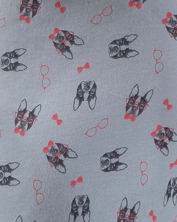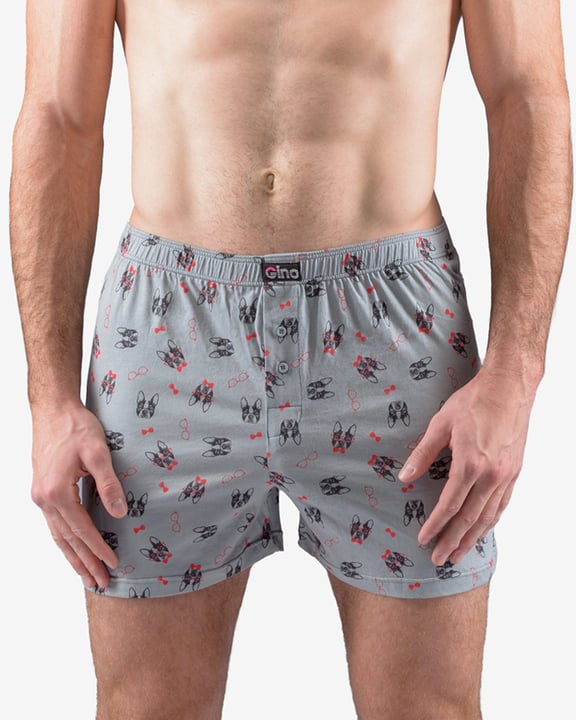 Volné trenky, pánské šité prádlo. V pasovém kraji je zašitá širší pruženka. Nohavičky jsou začištěné podehnutím. Na předním díle je vypracovaný rozparek na 2 knoflíky. Zadní díl je členěný středovým švem. Trenky jsou potištěné výraznějším vzorem.